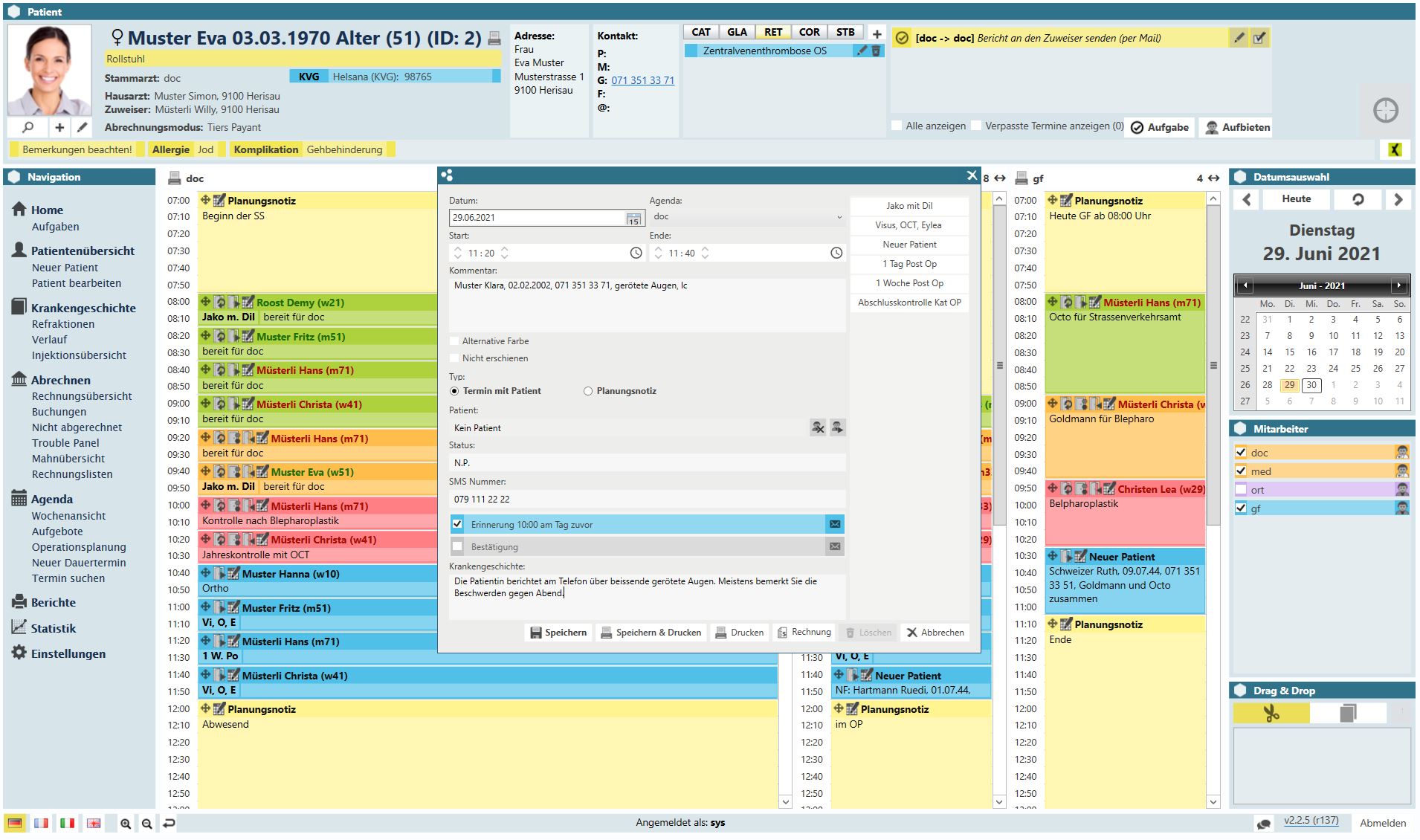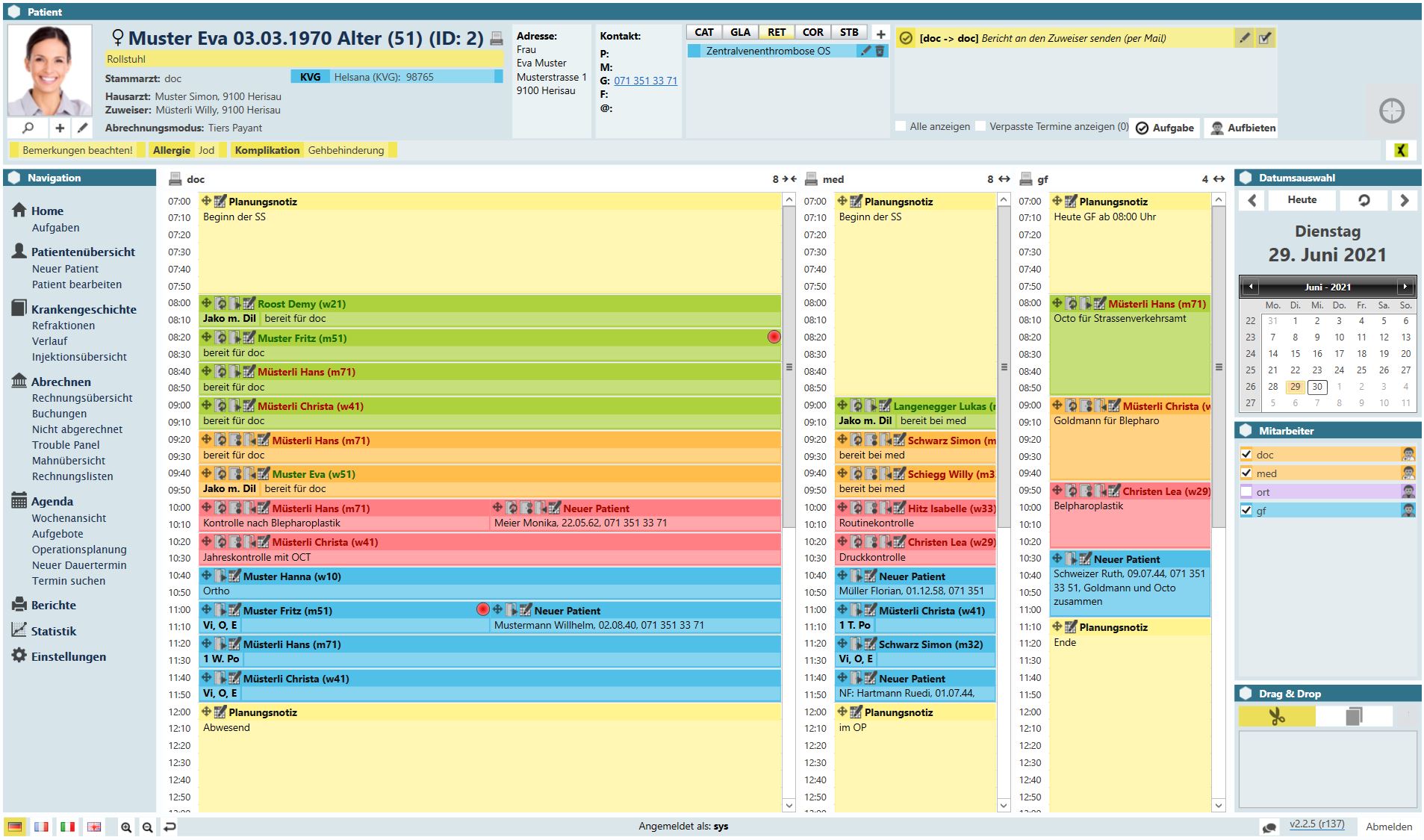 Je nach Praxisgrösse können Sie beliebig viele Agendabahnen einrichten (z.B. pro Arzt, pro Abteilung, Behandlung, etc.), die in der Luna-Agenda inkludiert sind. Dank Farbcodes sehen Sie auf einen Blick, ob der betreffende Patient im Wartezimmer sitzt, bereits behandelt wird oder die Praxis wieder verlassen hat. Für Ihre Patienten besteht die Option, Termine auch online zu reservieren. Beispielsweise über die Schnittstelle mit Onedoc. Diese sind automatisch mit der Luna-Software verknüpft.