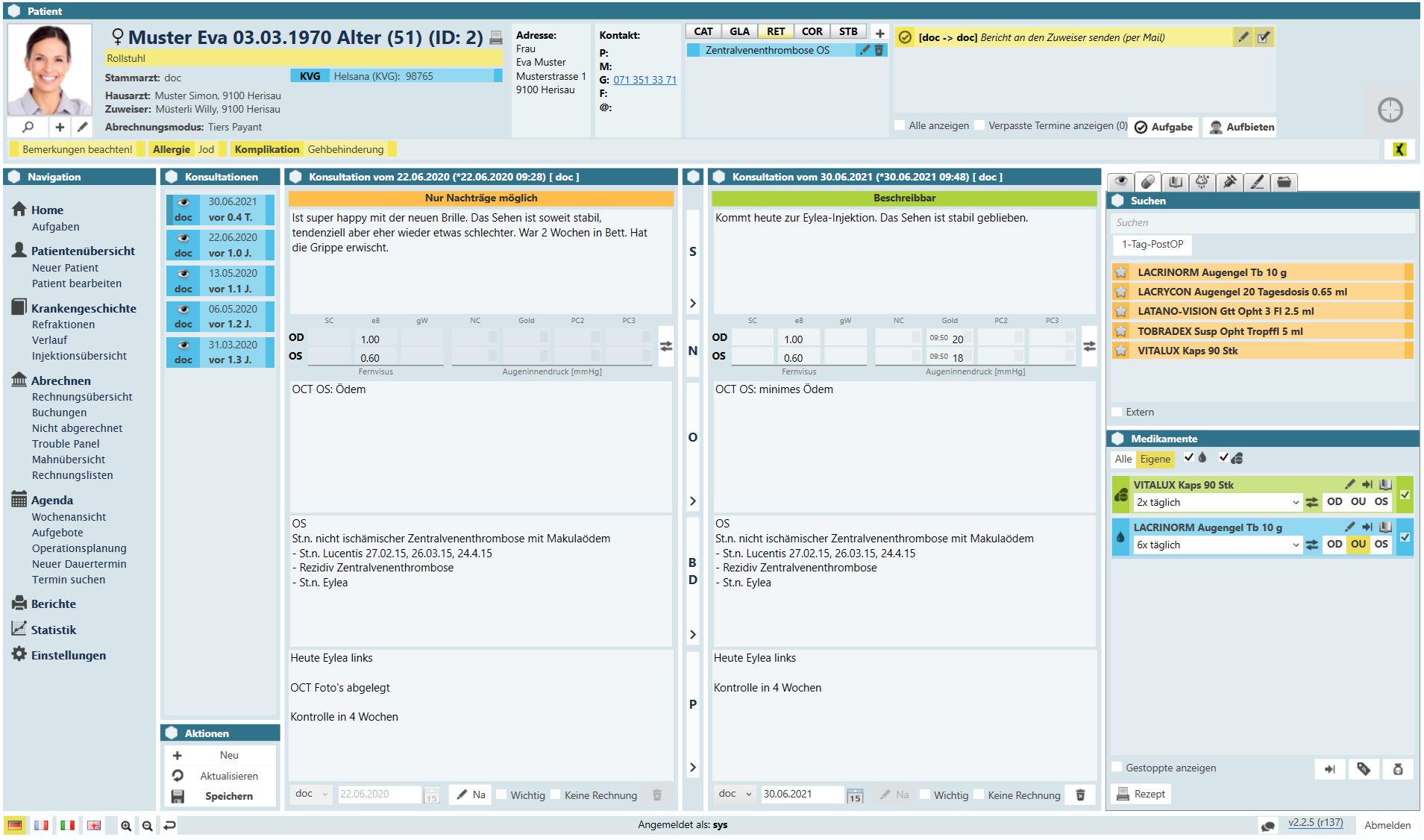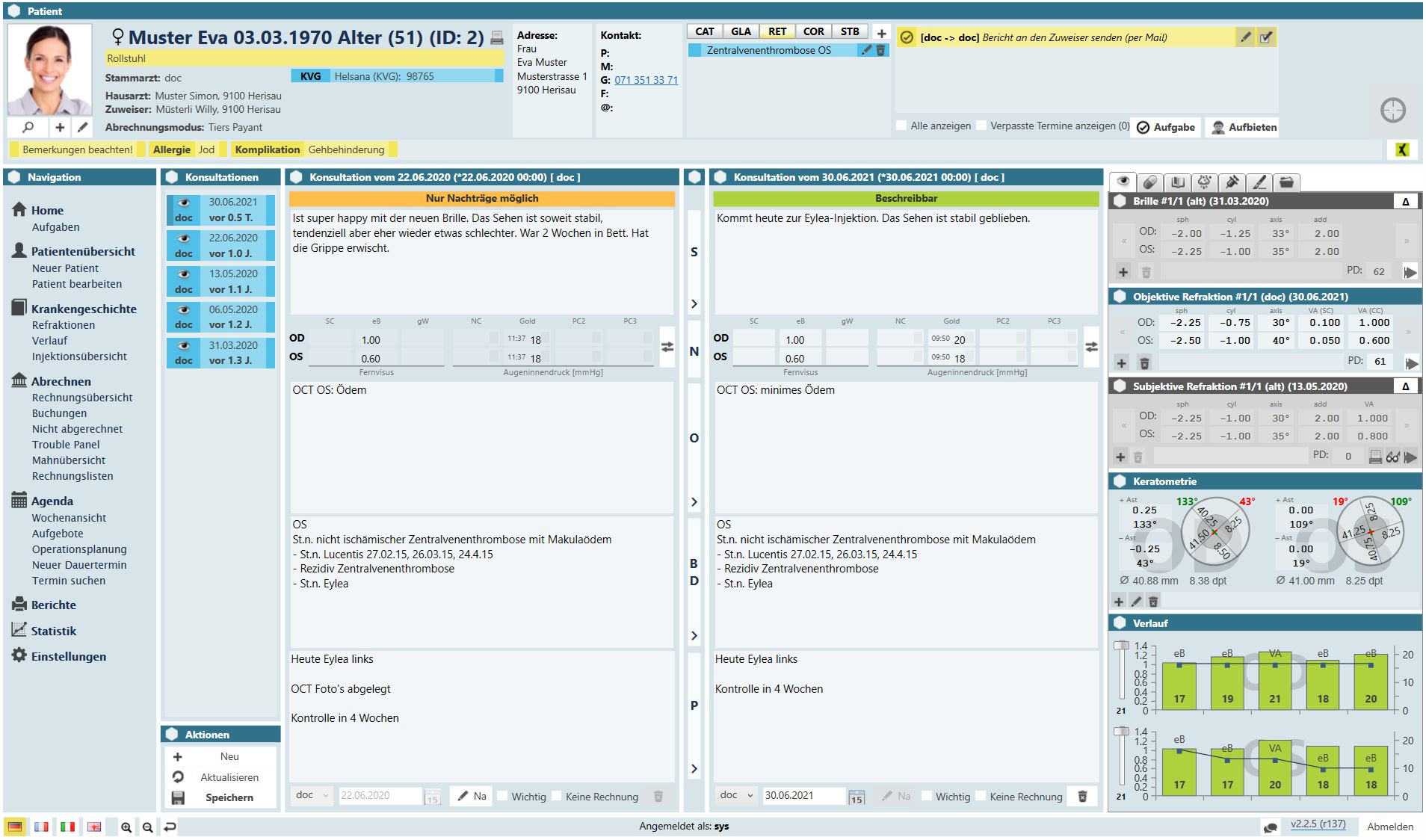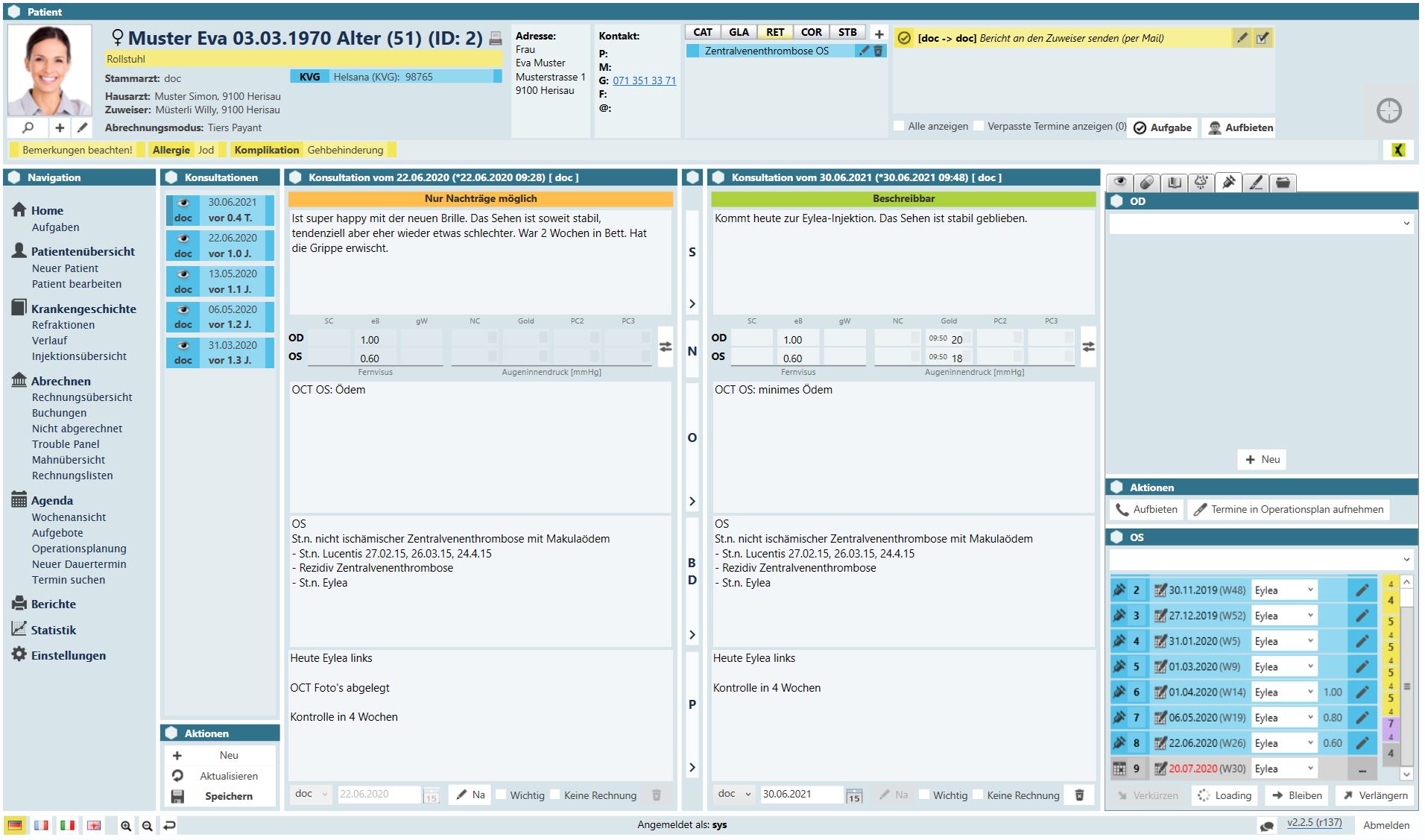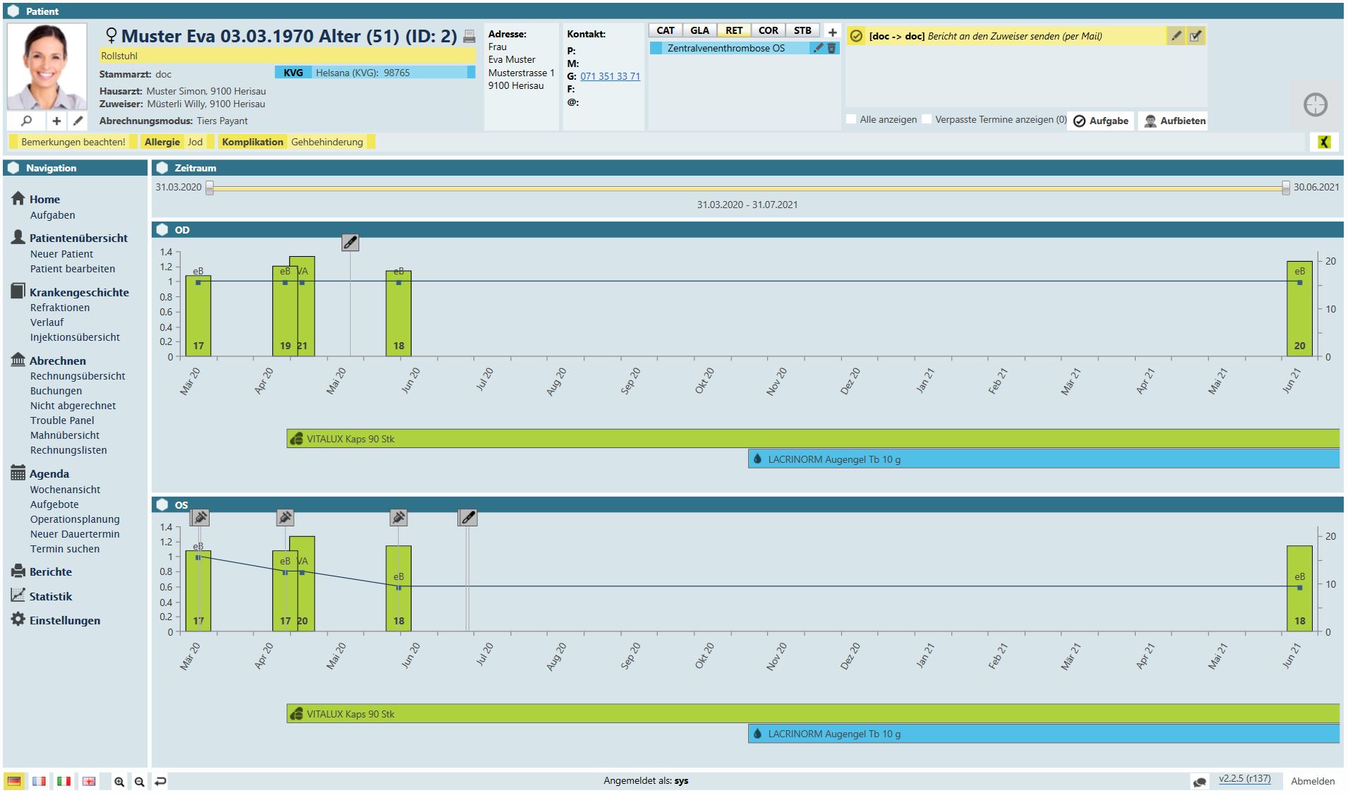 Diese Ansicht bietet Ihnen einen Überblick über den kompletten Behandlungsverlauf des Patienten. Die Maske zeigt Ihnen Druck- und Visusverlauf auf, sowie sämtliche Injektionen, Interventionen, Operationen und verordnete Medikamente.